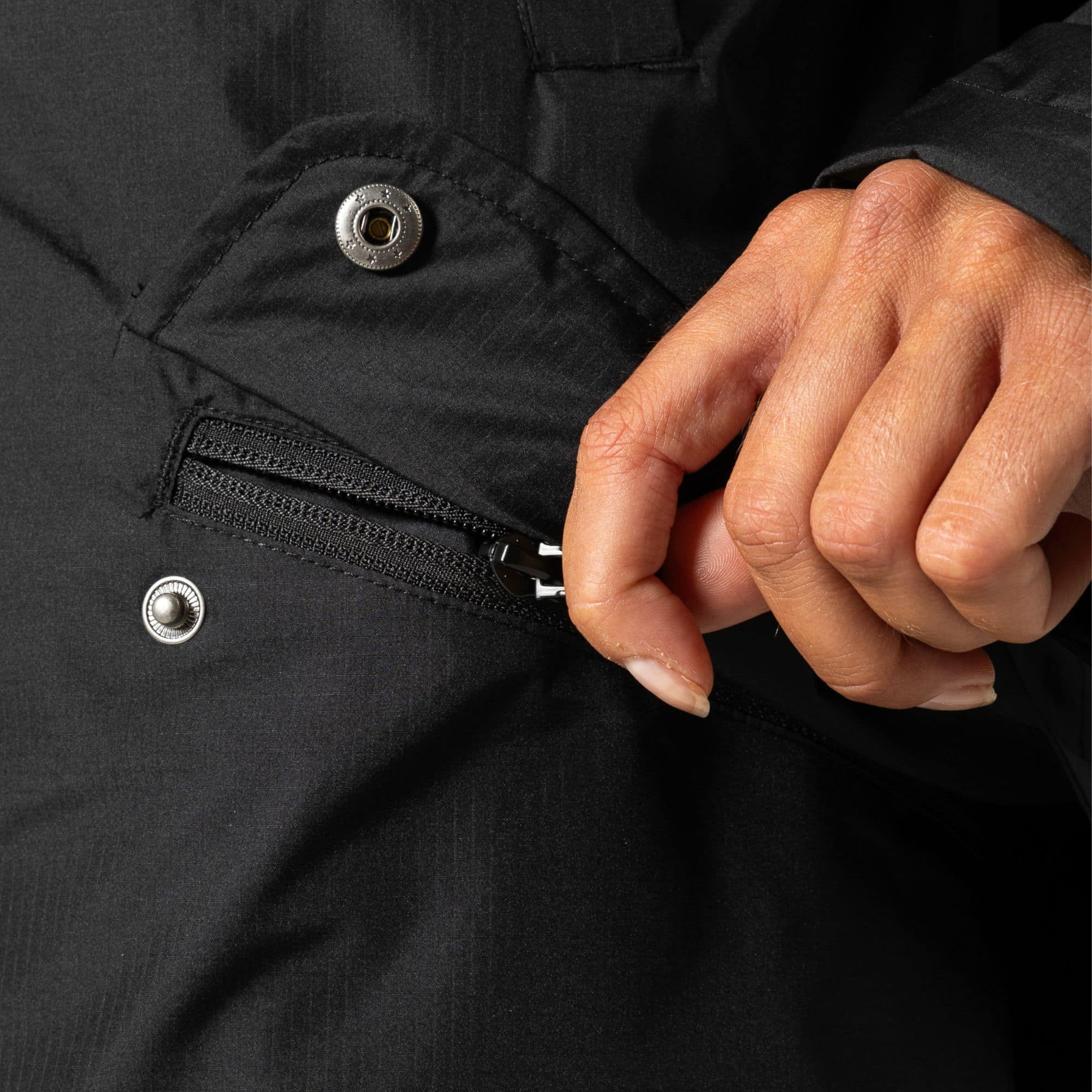 Chest zippered hand pockets with fleece lining and side zippered pockets with flap protection -
